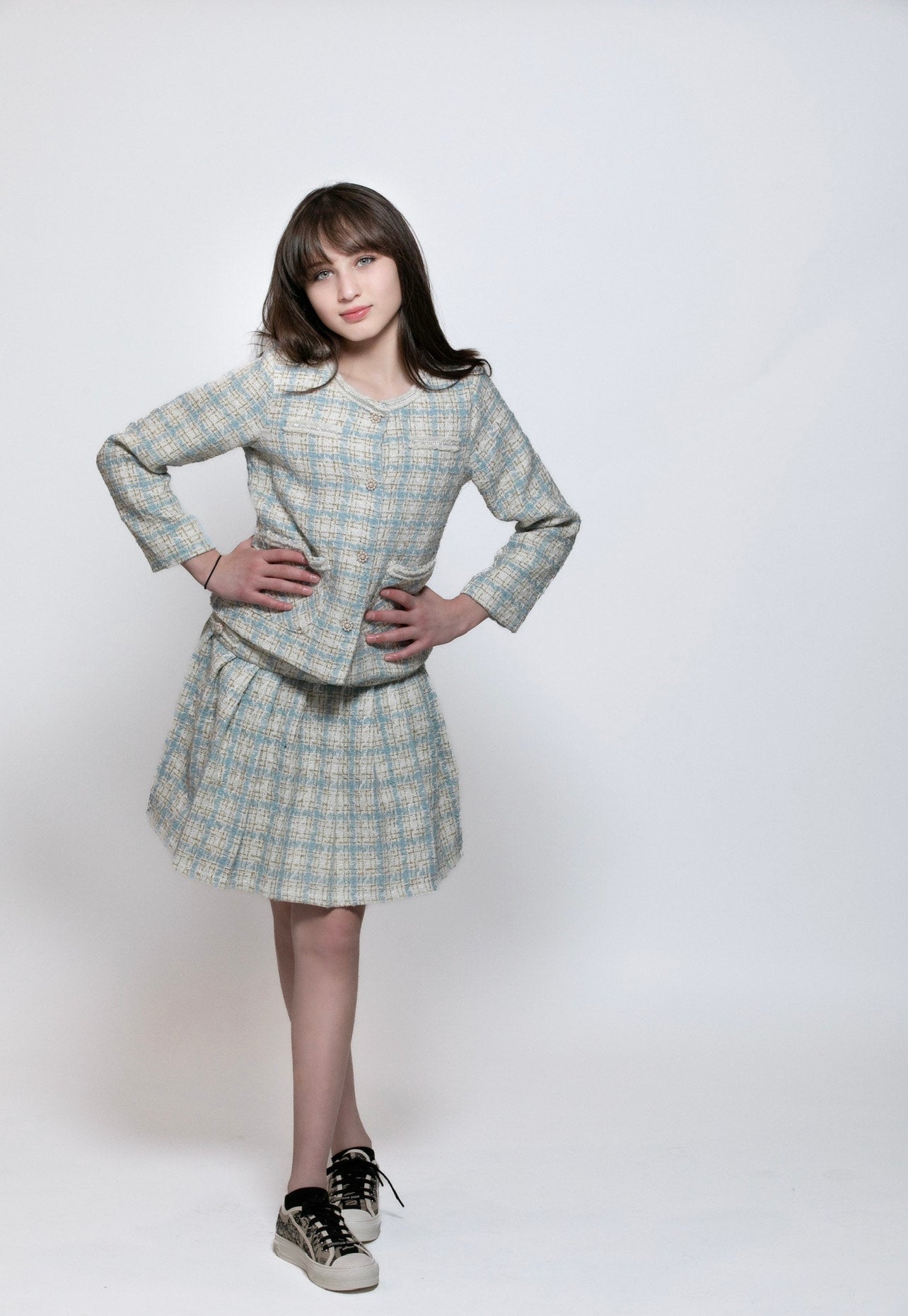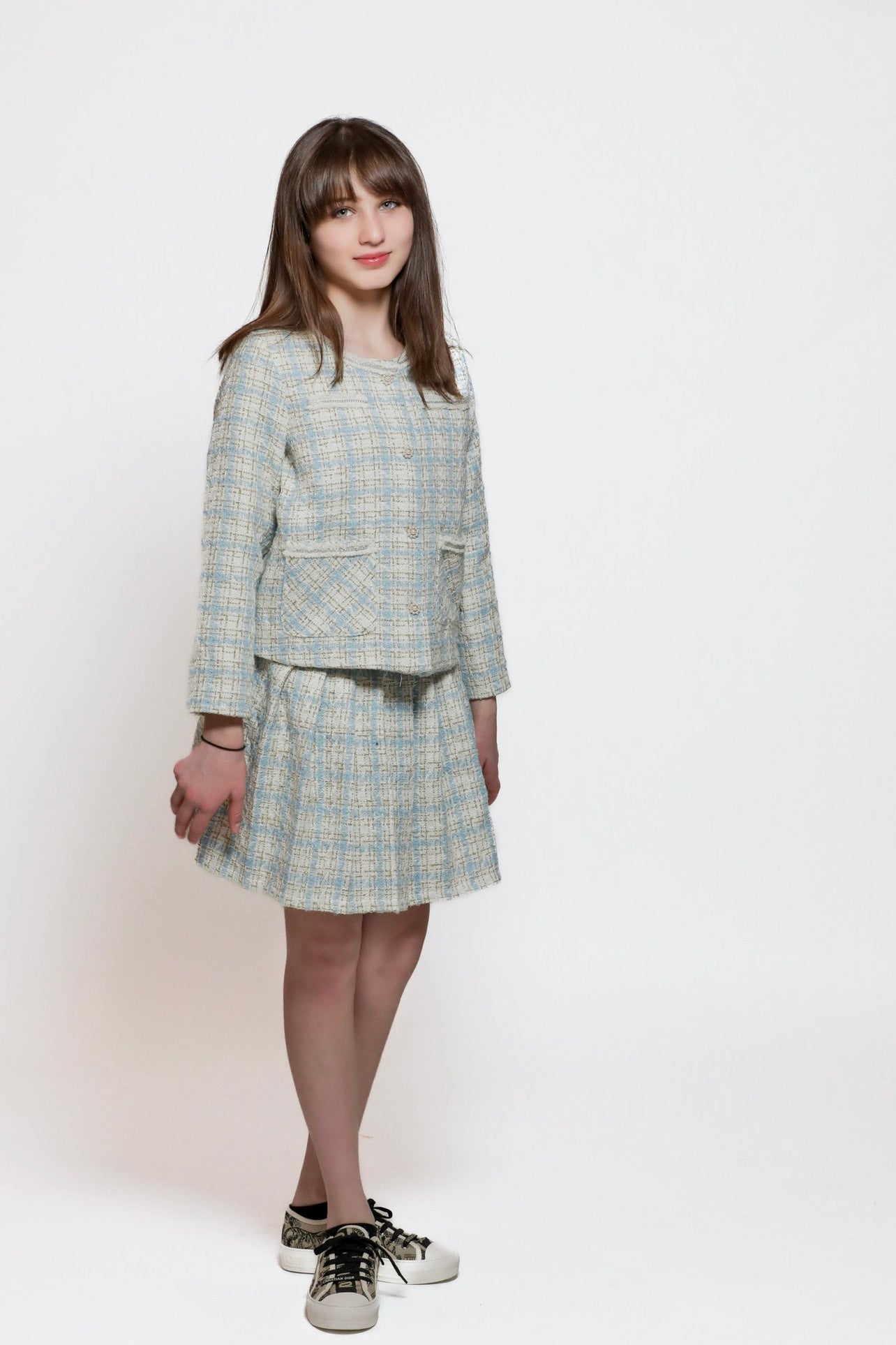 Two-piece turquoise tweed set, with a blazer and a flared skirt.