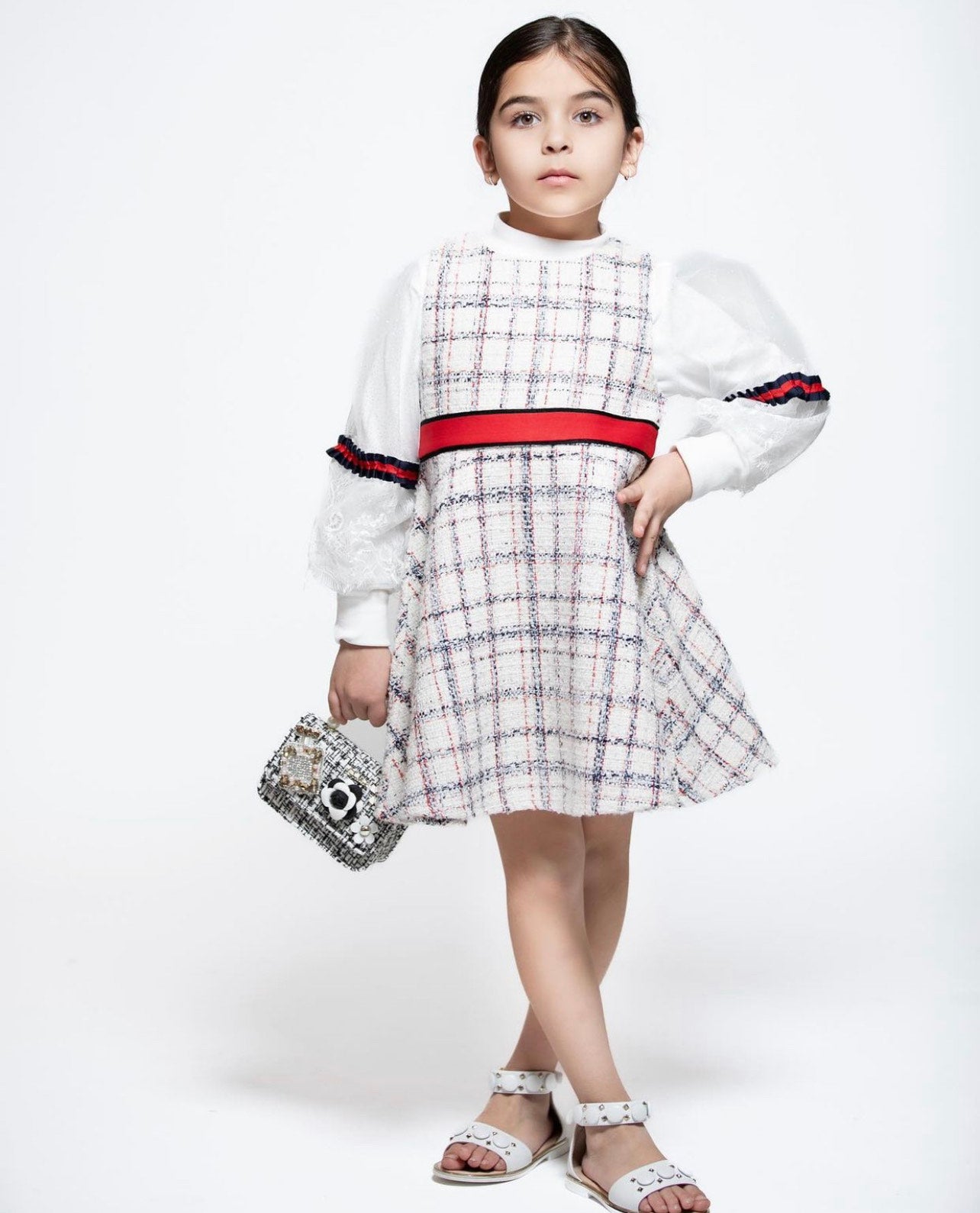 This three piece set comes with a tweed blazer, tweed dress with red accents, and a long sleeve with puffer sleeves.